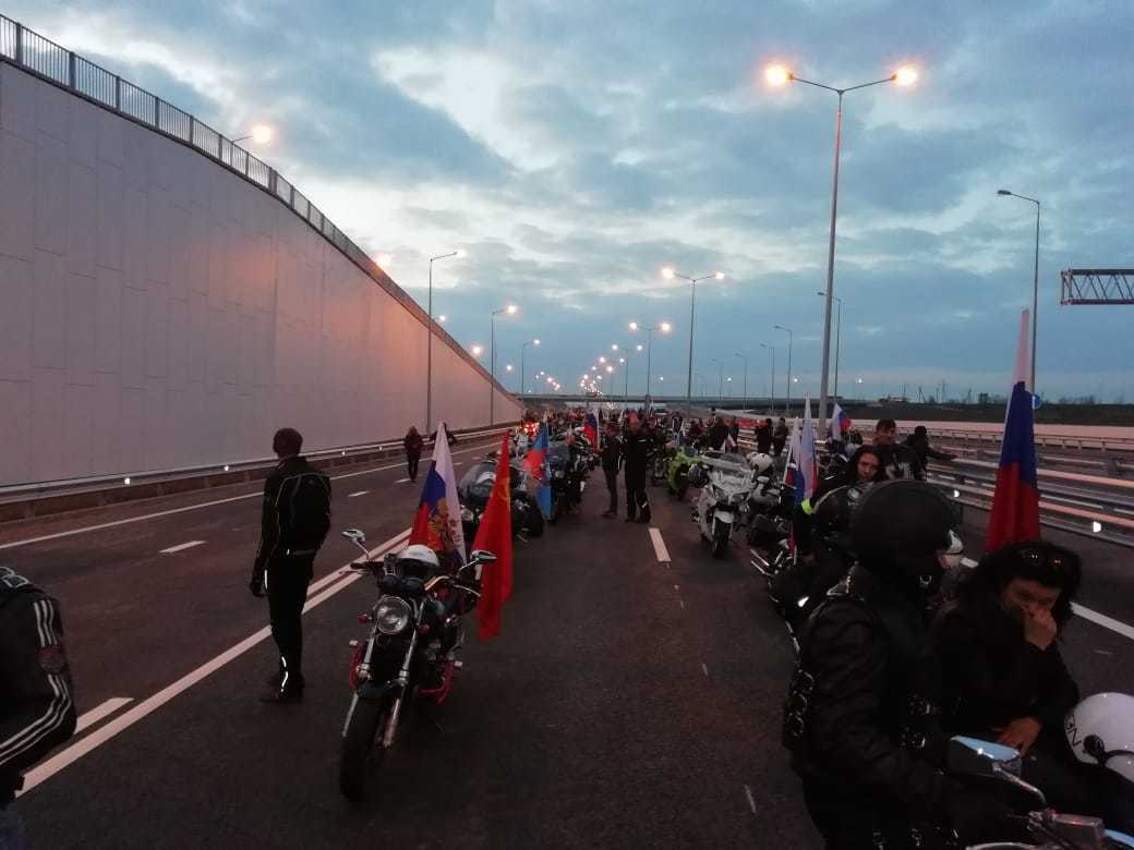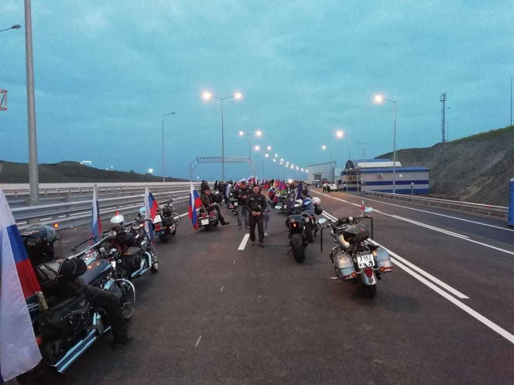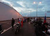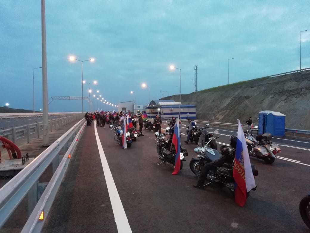 Уже перед самым рассветом организаторы мотоклуба «Ночные волки» начали выстраивать колонну, и после прохода КПП байкеры в шахматном порядке двинулись на мост. В 5:00 колонна приблизилась к началу транспортного перехода.