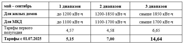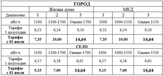 В связи с тем, что отменен понижающий коэффициент 0,7 для 3-го диапазона объемов электропотребления для всех помещений в МКД и жилых домах, независимо от их расположения и оснащения, с 01 июля тариф для данного диапазона равен 14,64 руб./кВт⋅ч