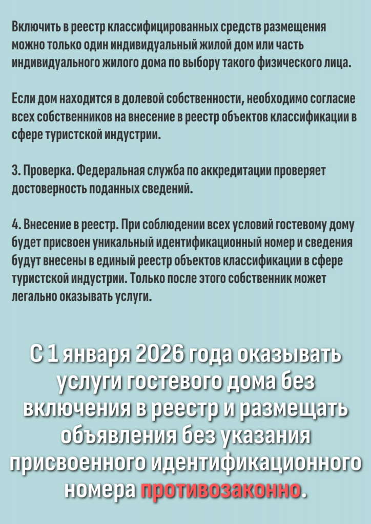 Поясняется, что гостевым домом считается индивидуальный жилой дом или часть индивидуального жилого дома, комнаты в котором используются для предоставления услуг гостевого дома. Также указано, что дом должен быть зарегистрирован в Росреестре и размещен на земельном участке с категорией "земли населенных пунктов", вид разрешенного использования которого предусматривает: