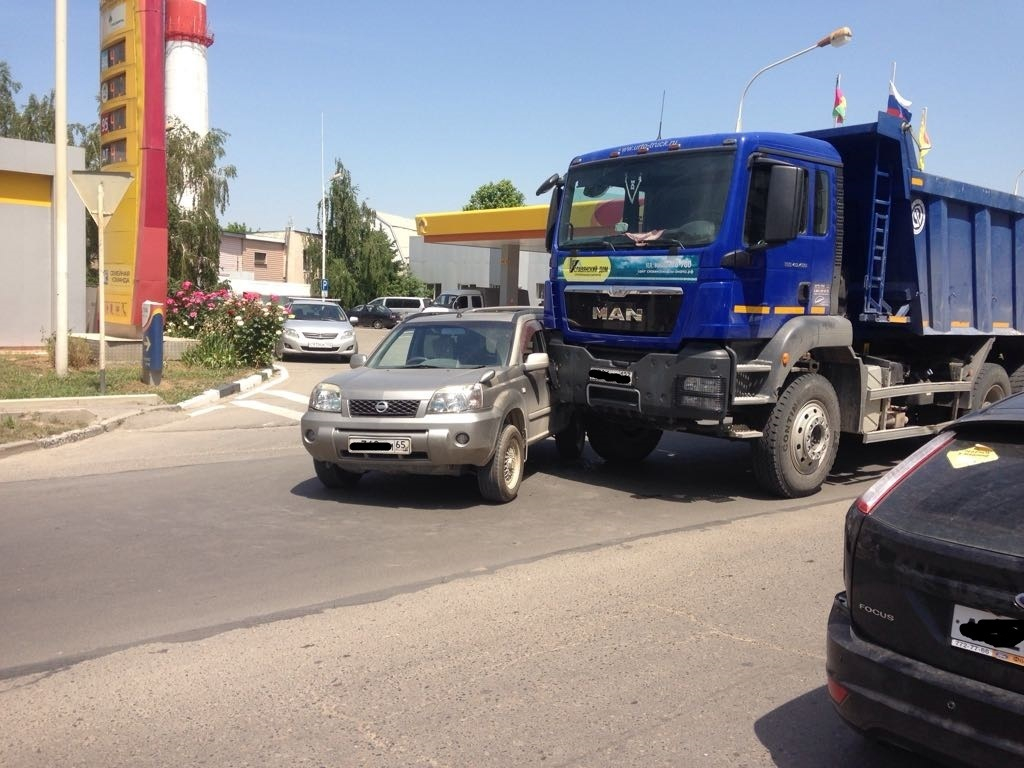 Сегодня, 28 мая, в 11.45 в Анапе на улице Омелькова большегруз «МАН» чуть не раздавил «Ниссан».