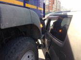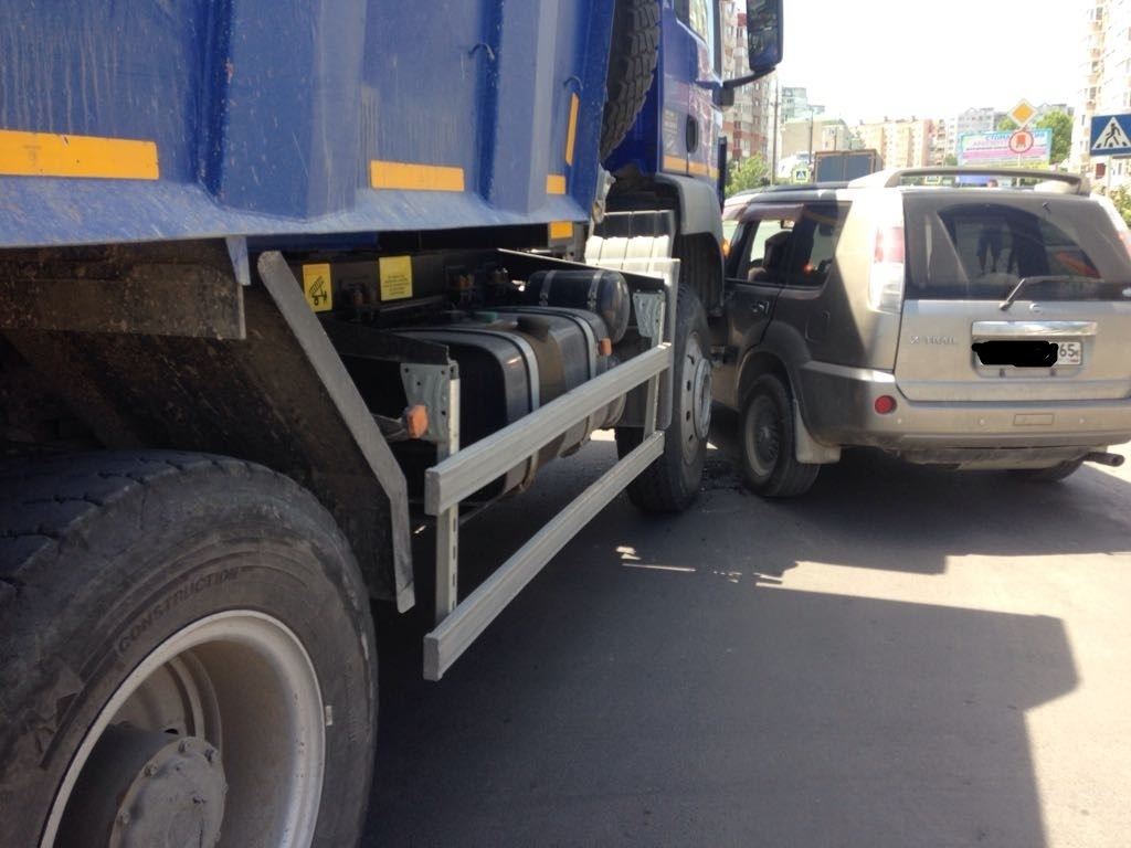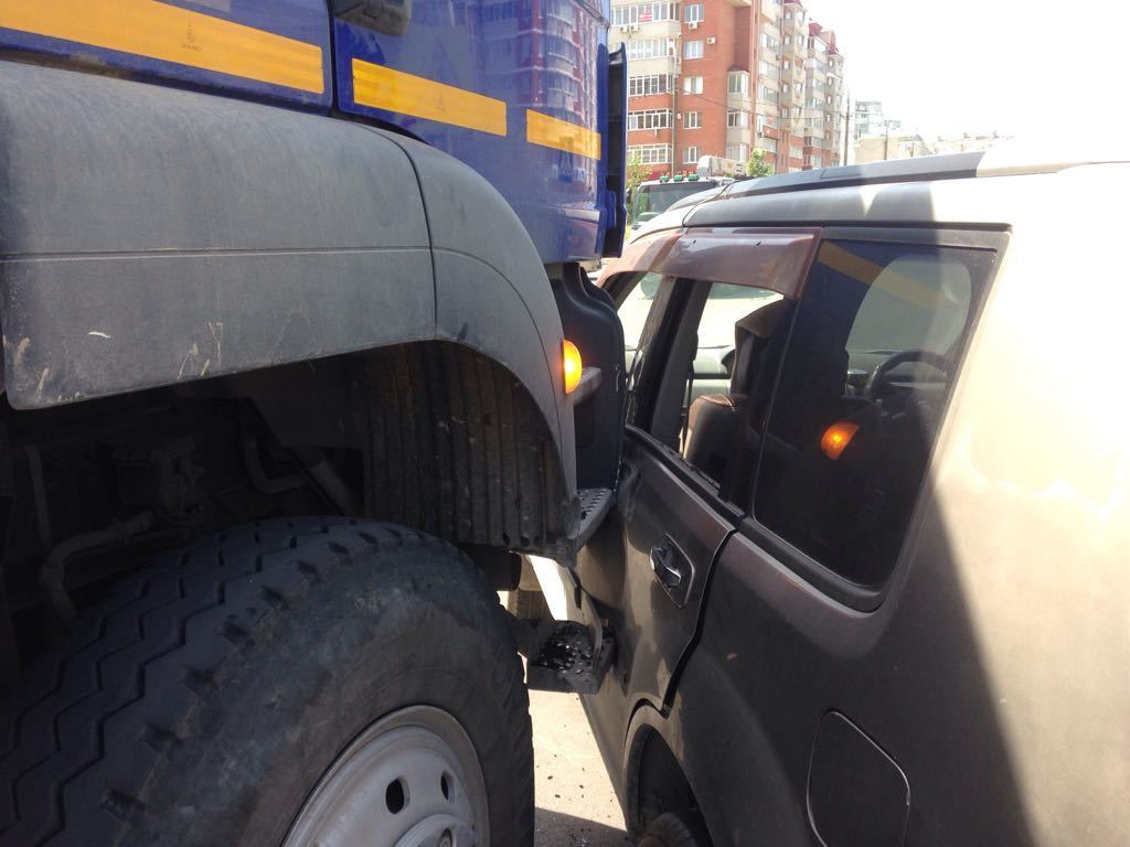 Водитель грузовика чудом не раздавил маленького джипа. Водитель «МАНа» вовремя успел затормозить. По словам очевидцев, пострадавших в результате аварии нет, досталось только "Ниссану". Трудно себе представить, чтобы было, если бы за рулем грузовика был менее внимательный водитель.