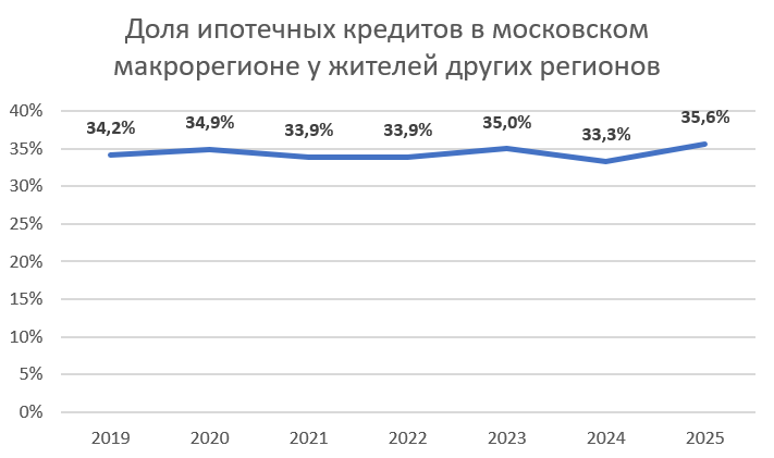 В 2025 году 35,6% ипотечных кредитов в Московском макрорегионе взяли жители других регионов. Вопреки распространенным в СМИ оценкам эта цифра достаточно стабильна.